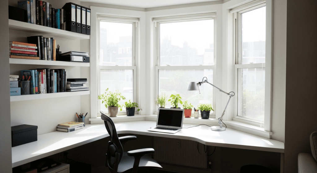 Install a custom desk that follows the bay window’s shape, creating a curved or angled workspace with views outside. Mount floating shelves above for books and office supplies, and add a comfortable desk chair that can be tucked under the desk when not in use. The bay window’s natural light reduces eye strain and creates an pleasant work environment.