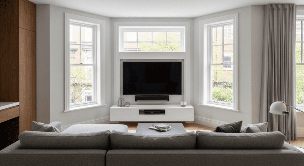 The bay window placement creates natural symmetry with windows flanking the entertainment center, adding architectural interest to what’s typically a utilitarian zone. The angles of the bay also help with sound distribution for speakers or soundbars.