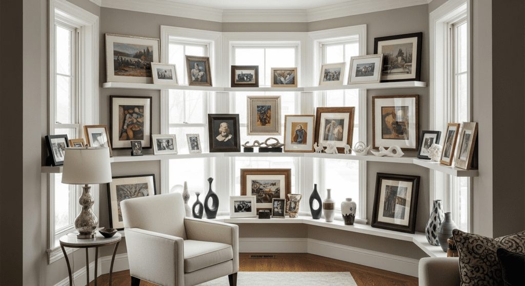 Install picture ledges or floating shelves at various heights within the bay window alcove. Display framed artwork, photography, or prints that you can easily rotate. The natural light illuminates the art beautifully during the day, creating a museum-like quality. Add small sculptures, decorative objects, or collectibles on lower shelves.