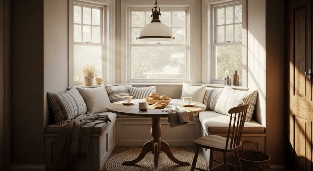Add storage underneath the banquette for table linens, placemats, or kitchen overflow. Hang a simple pendant light above the table to define the space and provide task lighting. Use washable fabrics for cushions since this is a dining area, and consider wipeable or sealed table surfaces.