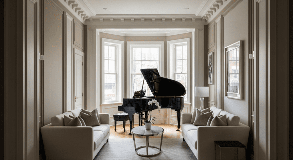 Position the statement piece centrally within the bay window, taking advantage of the natural light and architectural framing the bay provides. A baby grand piano looks stunning silhouetted against bay windows, while an ornate writing desk or vintage secretary cabinet becomes a dramatic focal point. The bay window acts as a natural frame that highlights the piece’s beauty.