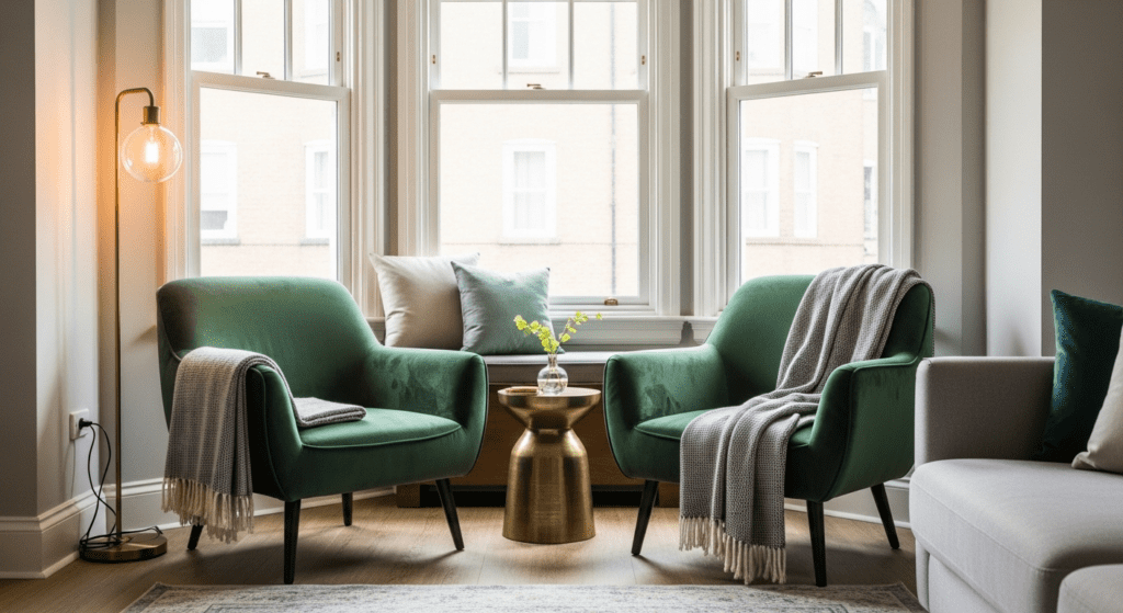 Position two comfortable armchairs angled toward each other within the bay window alcove, with a small side table between them for drinks or books. The bay window’s angles naturally create a semi-enclosed space that feels separate from the main living area while remaining visually connected. Add ottoman or footstool for additional comfort.