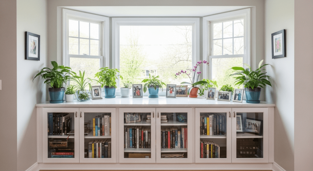 Install built-in cabinets with glass doors along the lower portion of the bay window, providing storage for books, board games, serving pieces, or media items. Top the cabinets with a continuous countertop that serves as a display surface for plants, decorative objects, or family photos. The upper portion remains open to windows for natural light.