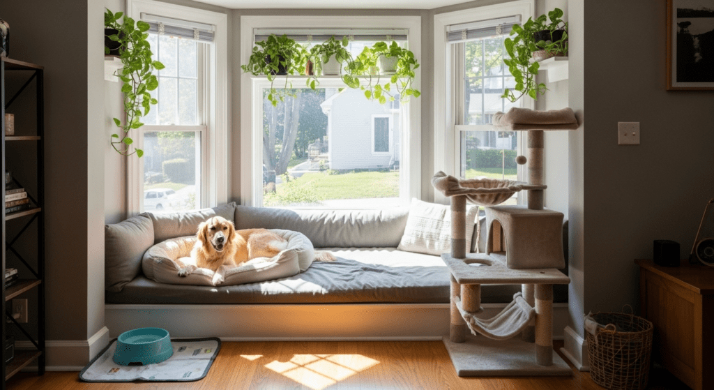 Install a low platform or wide window seat with a comfortable pet bed positioned to catch the sun. The bay window’s multiple angles provide various sunny spots throughout the day as the sun moves. Add pet-friendly plants (non-toxic varieties) on higher shelves and a small basket for toys. Consider installing a cat tree or climbing shelves if you have cats.