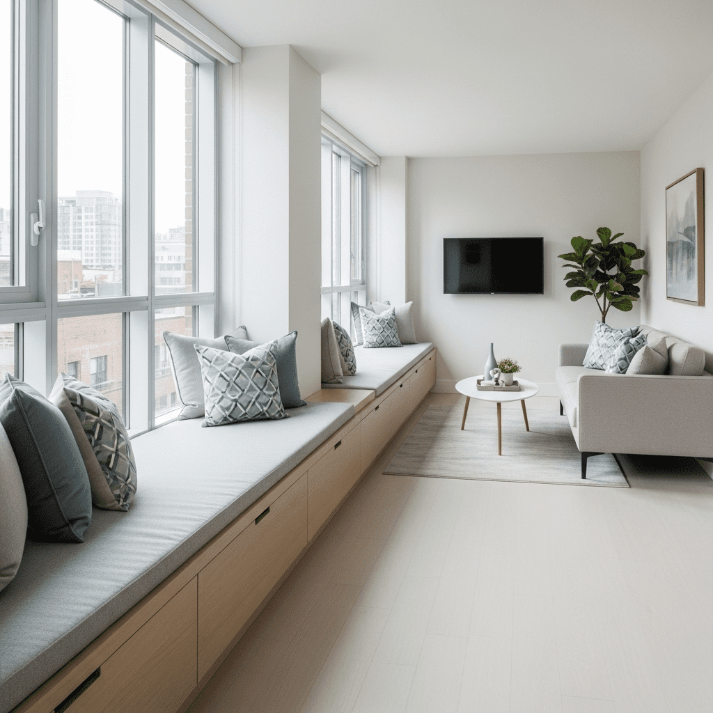 Position your main seating perpendicular to the window seat. The built-in solution adds charm while solving storage challenges common in condos where closet space is limited.