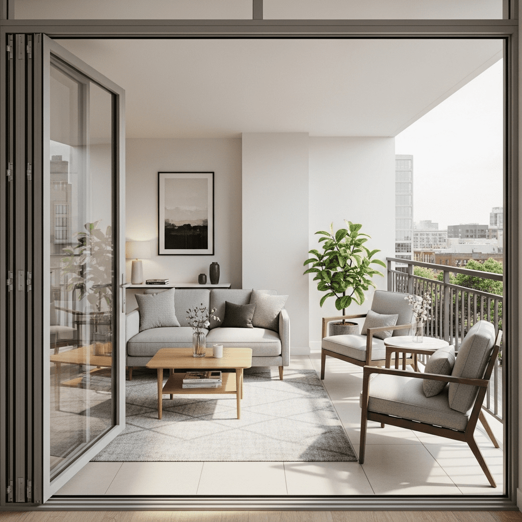 Position furniture to maintain clear, direct access to the balcony. When weather permits, open the balcony doors and extend your living space outdoors. Coordinate indoor and outdoor furniture styles and colors for visual continuity.