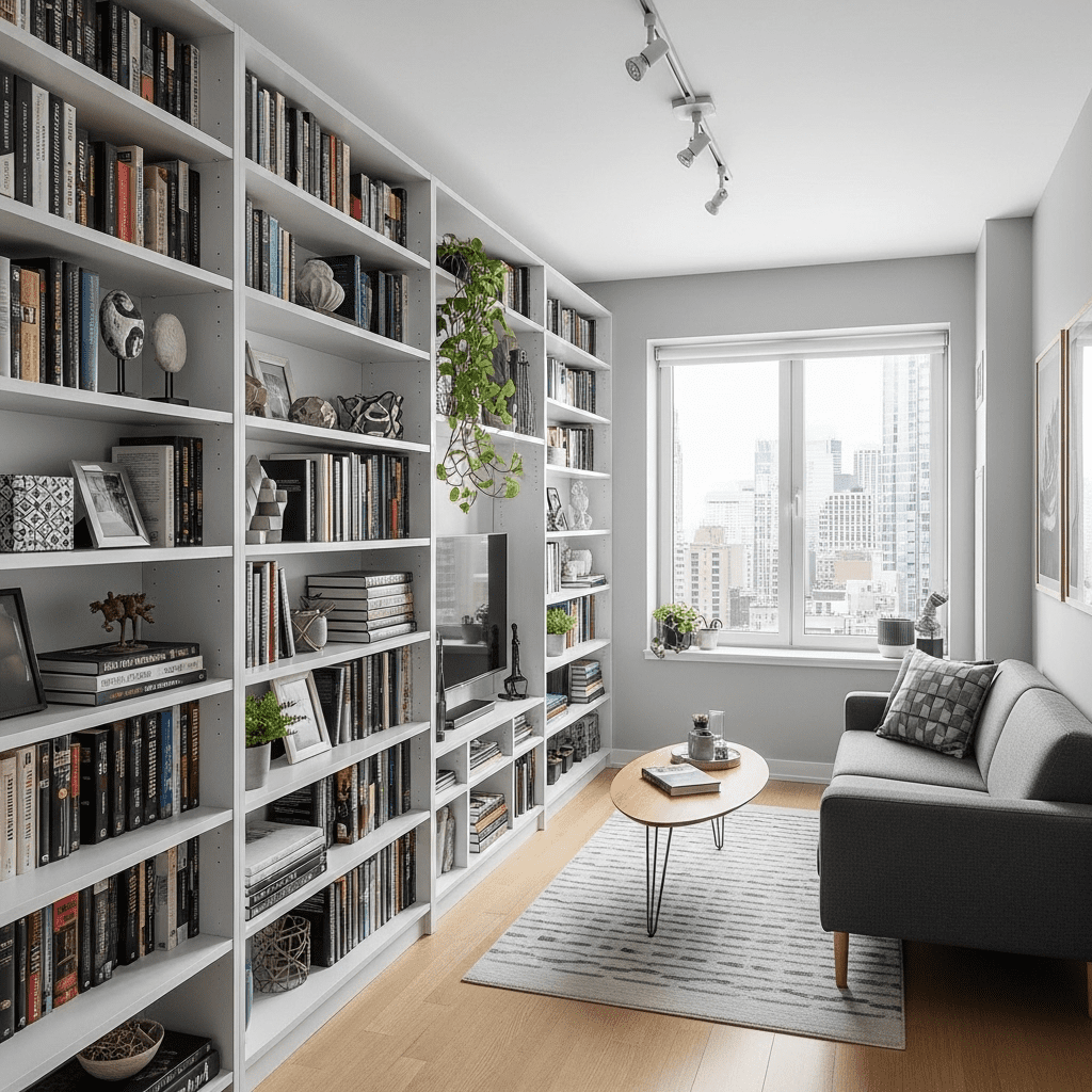 Install tall bookcases, floating shelves, or built-in cabinets that extend to the ceiling. Use vertical space for storage and display rather than bulky low furniture that spreads across the floor. This draws eyes upward and makes ceilings feel higher.