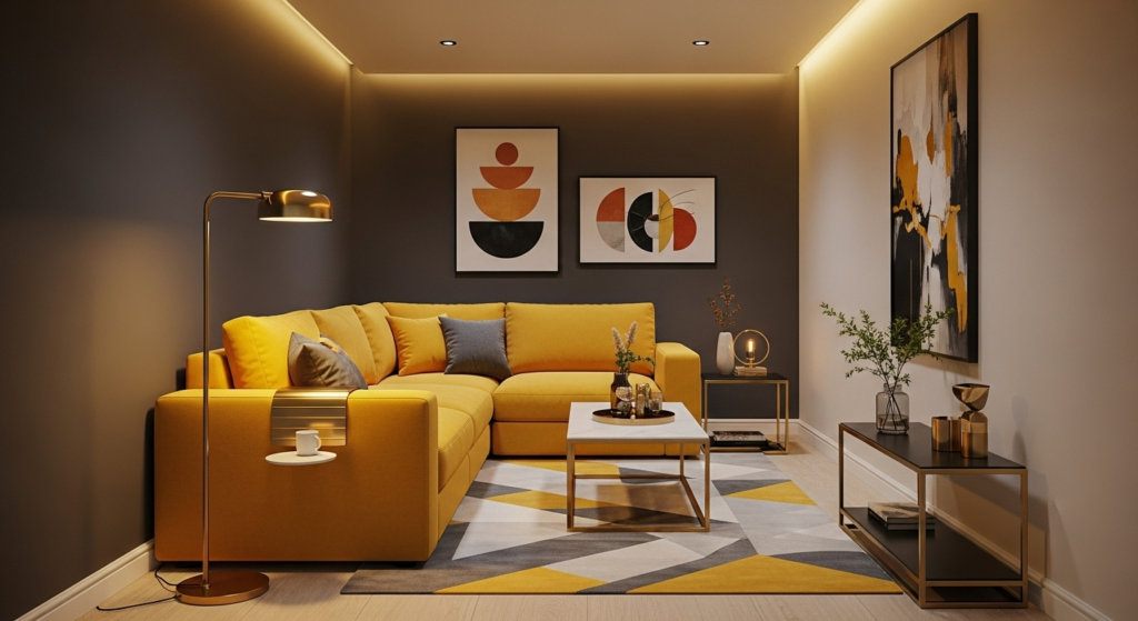Select a corner sofa in a color that contrasts with your walls to clearly define your seating zone in the narrow space. This visual anchor creates the illusion of distinct areas within your long room, making it feel more balanced and intentional rather than tunnel-like.
