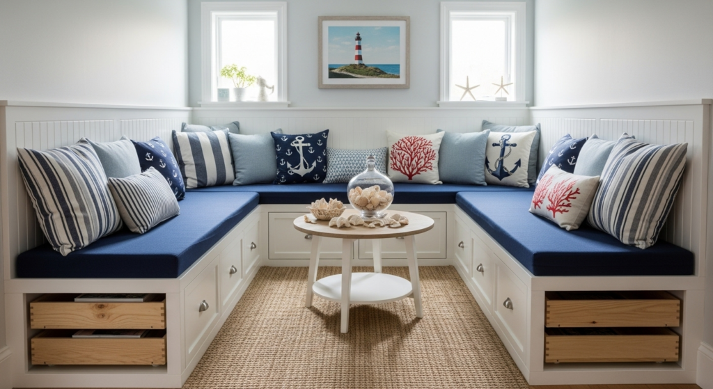 Create a custom corner sofa solution with built-in seating along two walls of your narrow room. Add cushions and pillows for comfort while incorporating storage drawers underneath. This approach maximizes every inch of your space while providing generous seating.