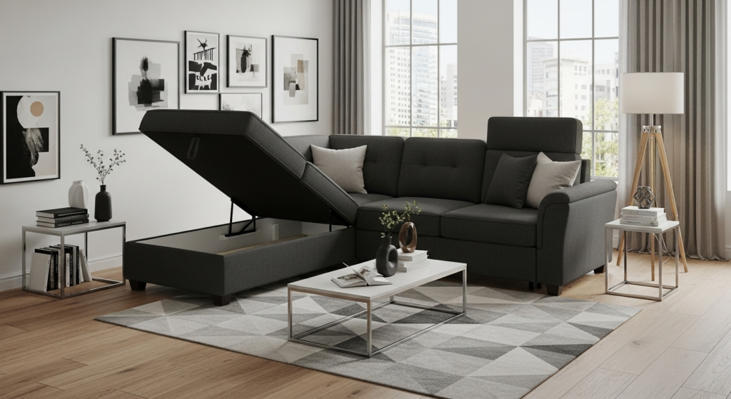 Maximize functionality by choosing a corner sofa with integrated storage compartments in the base or ottoman sections. In narrow living rooms where every square foot counts, hidden storage keeps your space clutter-free while maintaining the sleek lines necessary for a streamlined look.