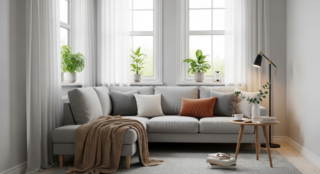 If your narrow room has windows that meet at a corner, position your corner sofa to embrace this architectural feature. This layout creates a bright, airy seating area that takes advantage of natural light from two directions while making efficient use of the corner space.