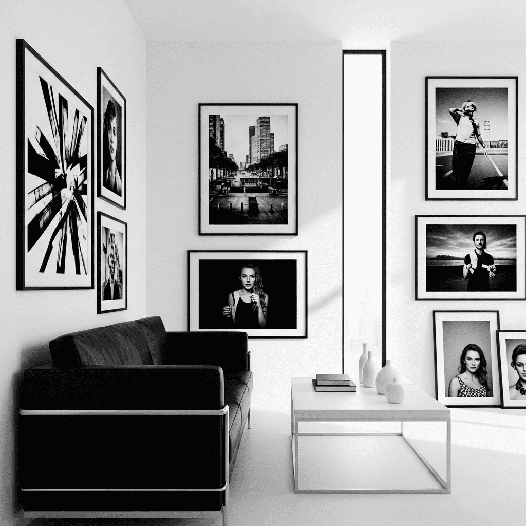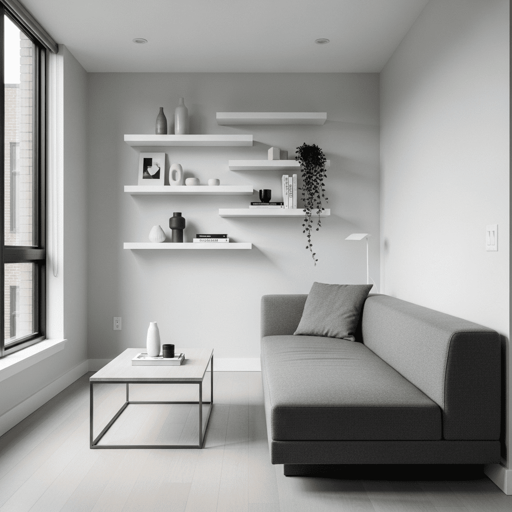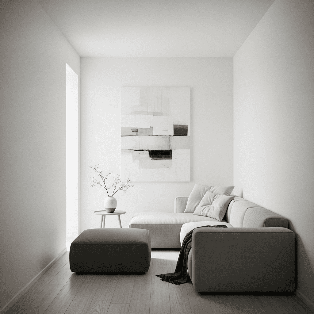 Use crisp white walls with light gray sofa and charcoal accents. Keep decor minimal—one statement piece of art, few carefully chosen objects. The restrained palette creates calm sophistication.