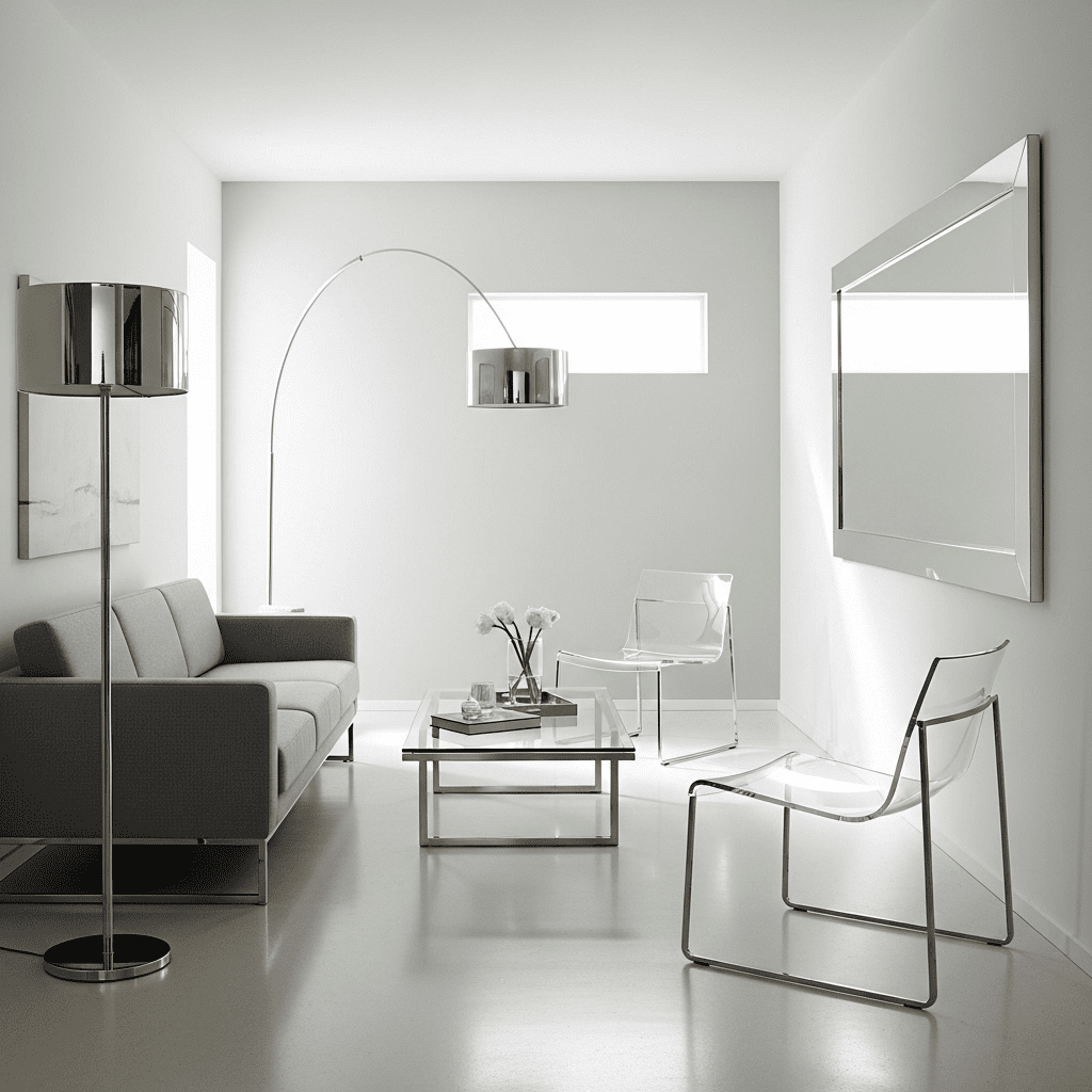 Choose glass coffee table, chrome floor lamp, acrylic chairs. The transparent and reflective materials maintain openness essential in narrow spaces. Add white or gray upholstery.