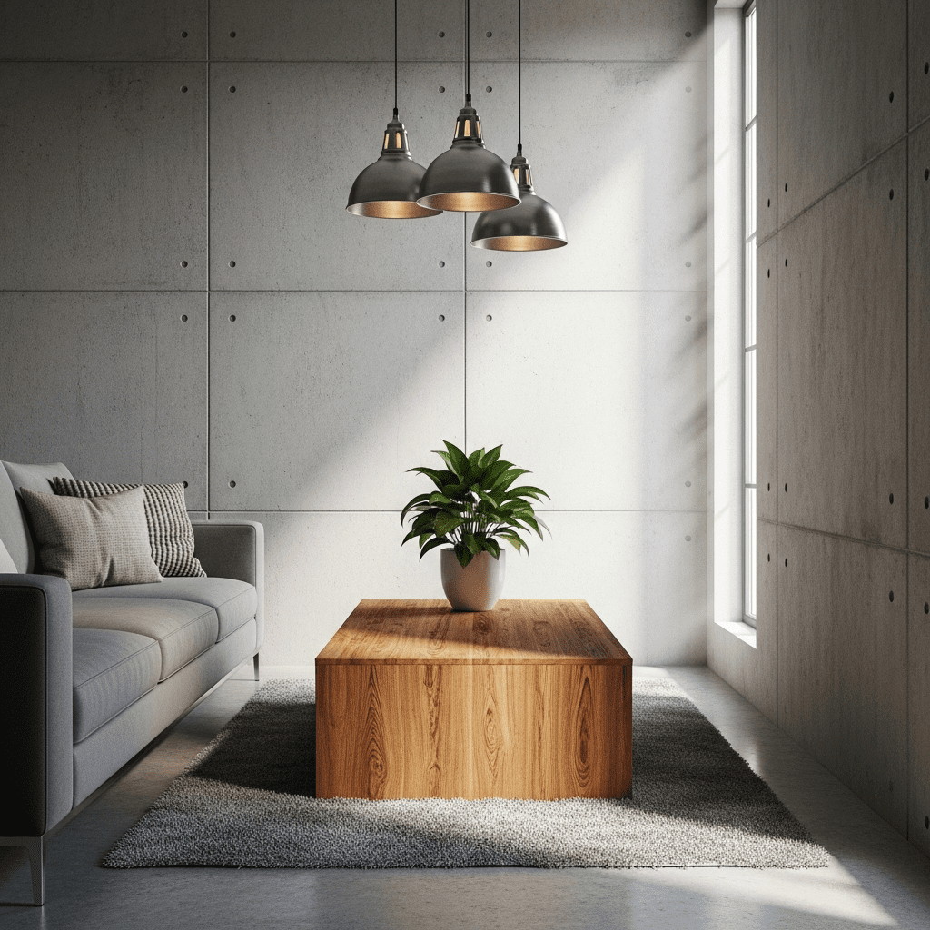 Use concrete-look walls or accent wall, warm wood furniture, metal fixtures. The industrial materials create edge while wood adds warmth. Keep color palette neutral.