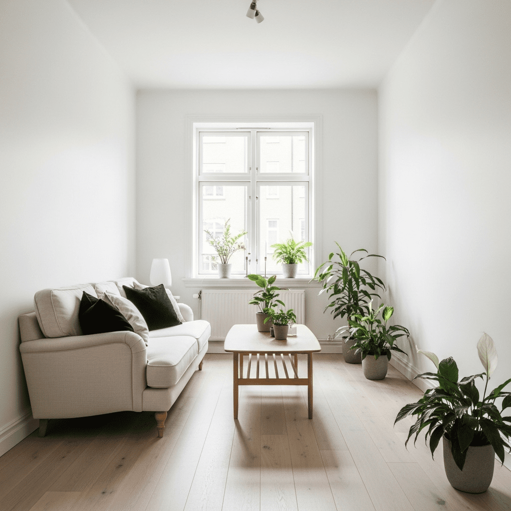 Use white walls, light oak furniture, cream upholstery. Add minimal black accents and abundant plants. The Nordic approach creates bright, functional modern space.