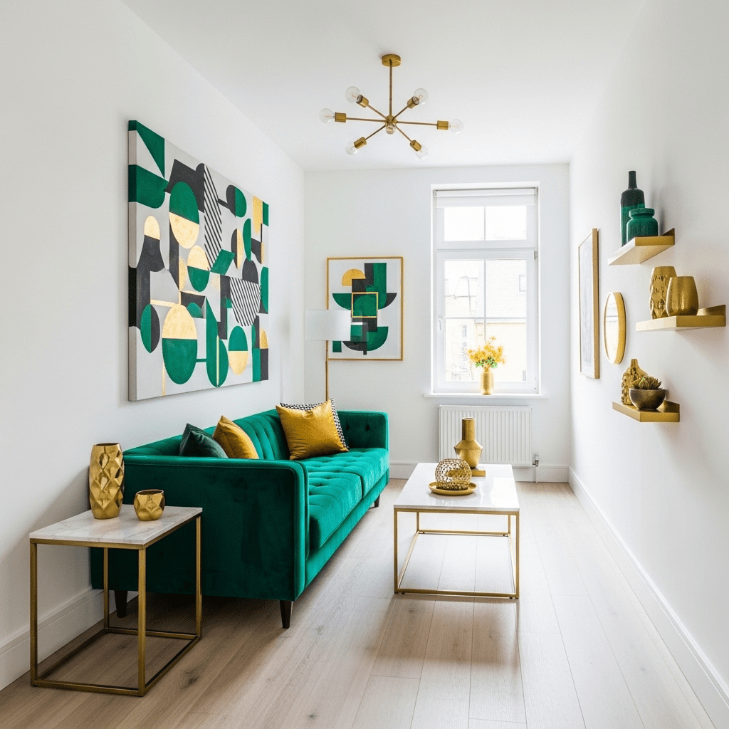 Choose statement sofa in vibrant color—emerald green, sapphire blue, or mustard yellow. Keep walls white or gray. Add geometric artwork in coordinating colors.