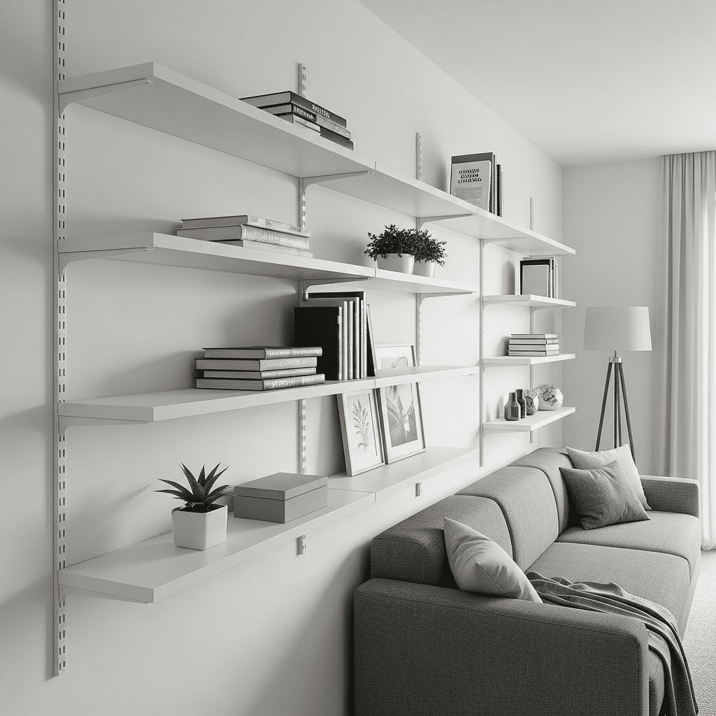 Mount white or wood floating shelves at varying heights on long wall. Display books, plants, and objects minimally. The open shelving maintains modern airiness.