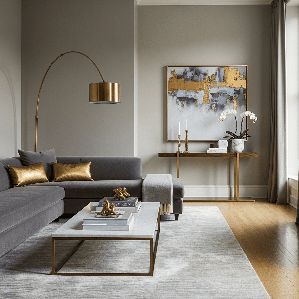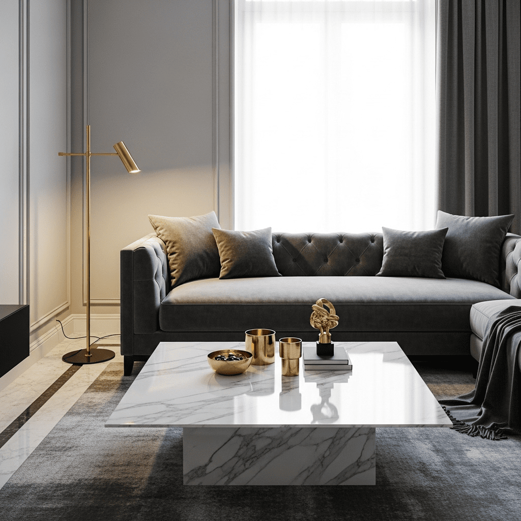 Use marble coffee table, brass lighting fixtures, brass hardware. Pair with neutral upholstery. The luxurious materials create elevated modern sophistication.