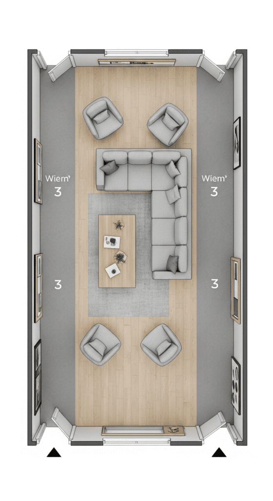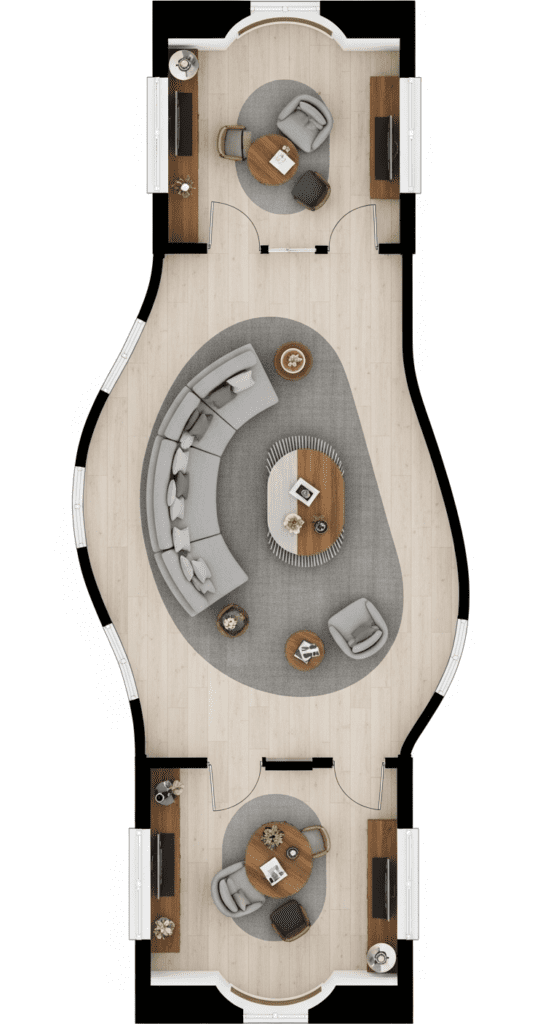 Float furniture in the center with clear pathways along both long walls.