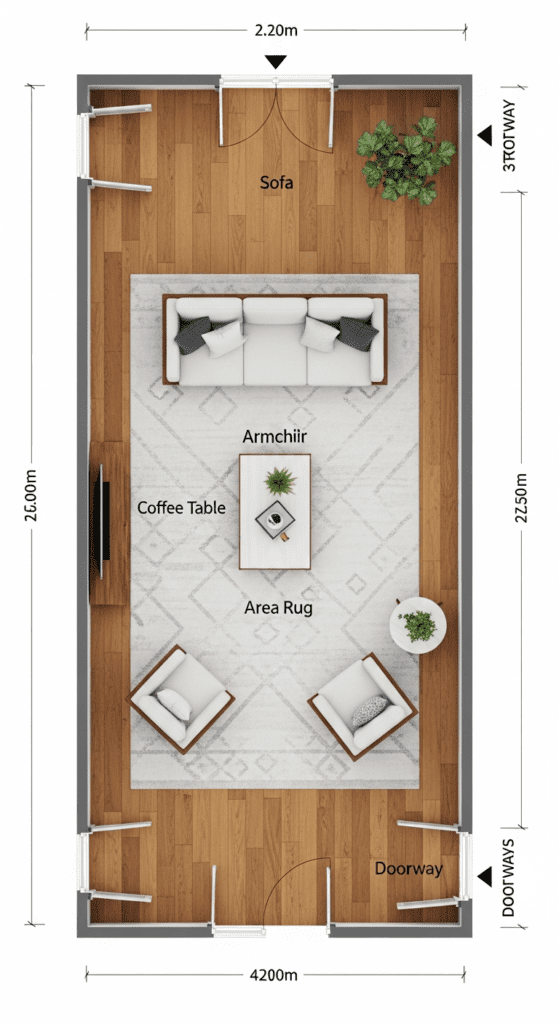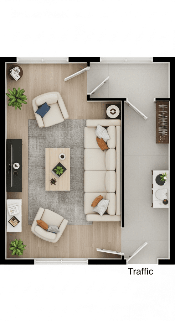 Prioritize Pathways: In two-entrance rooms, traffic flow takes priority over maximizing seating. Accept less furniture for better flow.
