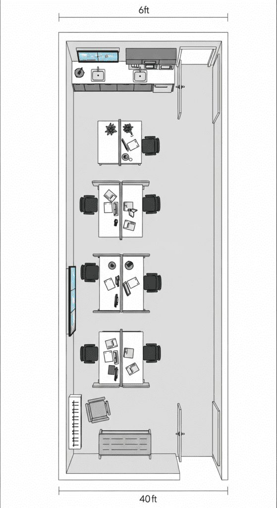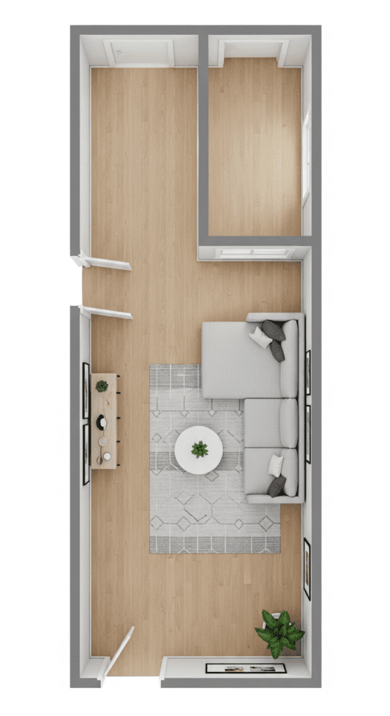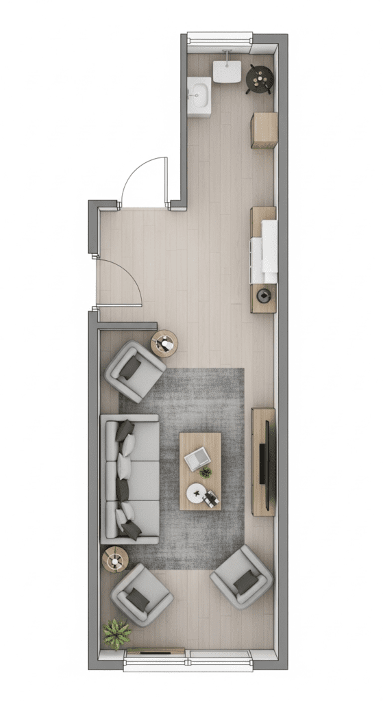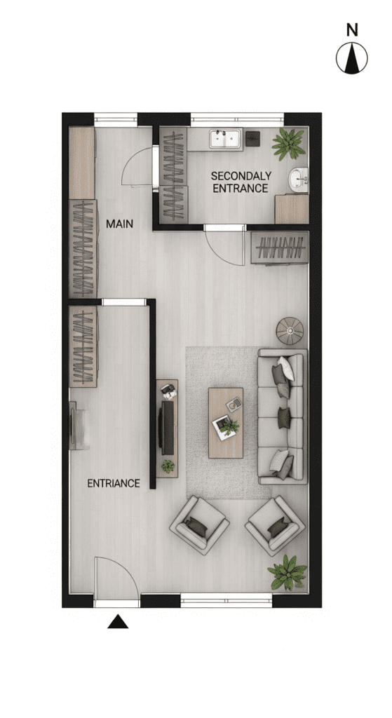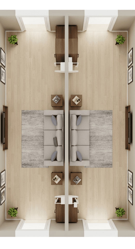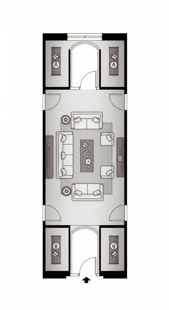 Map Traffic First: Before placing any furniture, identify main traffic patterns between the two entrances. Design around these flows.