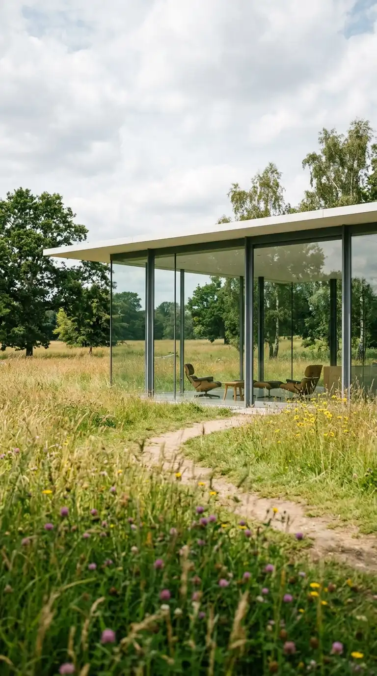 The glass pavilion is a transparent box. The walls are floor-to-ceiling glass. The roof is a thin white slab. The structure is minimal — thin steel columns, flush details. The glass pavilion disappears. The landscape becomes the room.