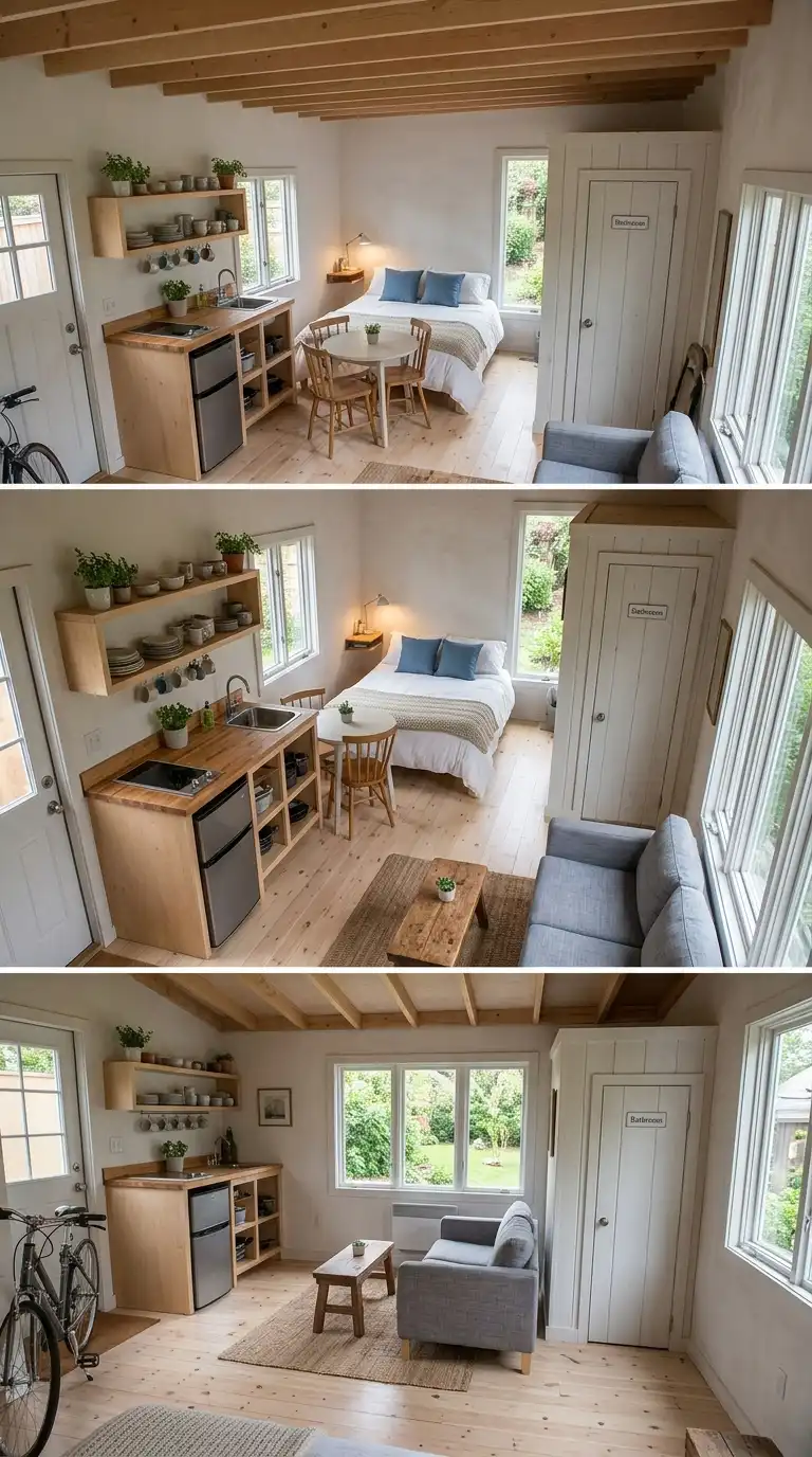 The one-room house is a single volume with no interior walls. Sleeping, living, cooking, and eating happen in the same space. The only separate space is the bathroom. The one-room house is small, efficient, and free.
