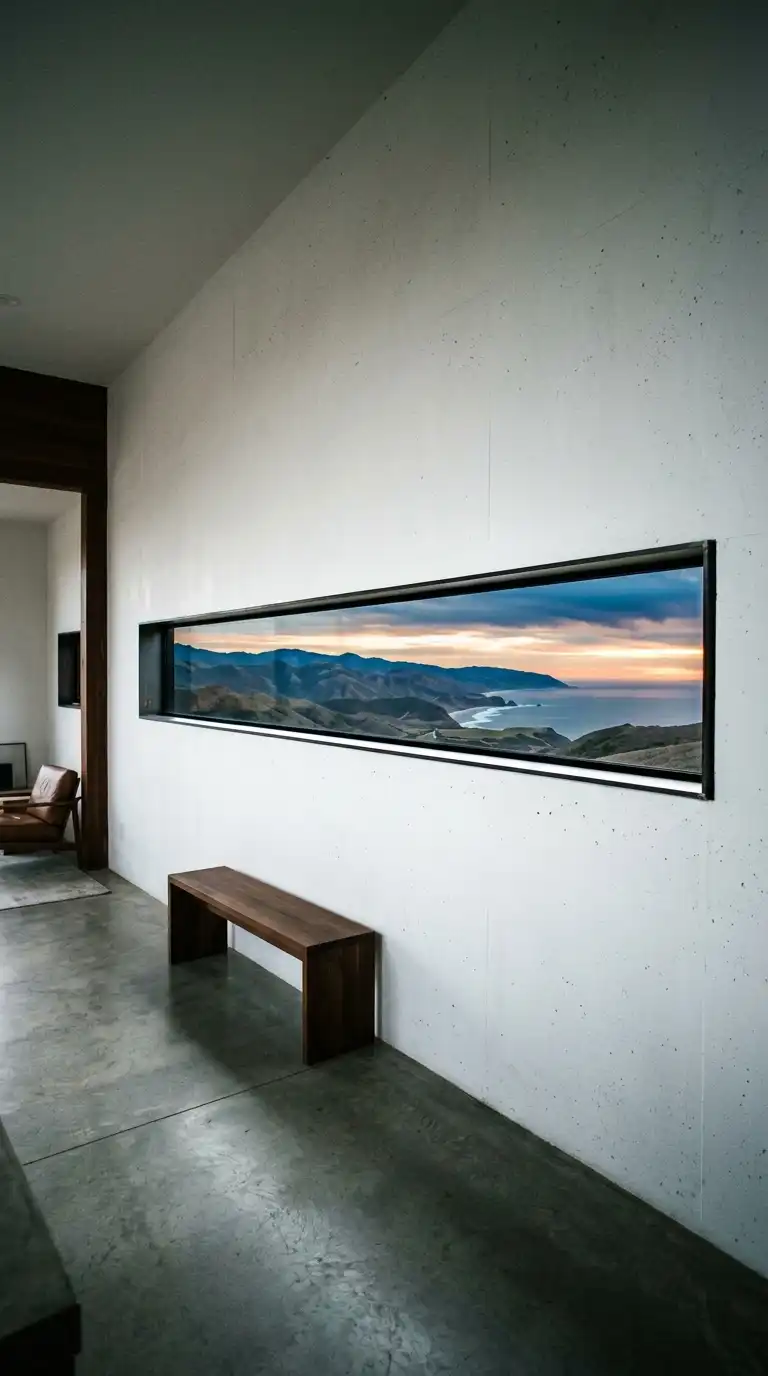 The slot window house has narrow horizontal slot windows instead of large picture windows. The slots frame specific views — a strip of horizon, a line of trees, a slice of sky. The slots create drama and mystery. The rest of the wall is solid.