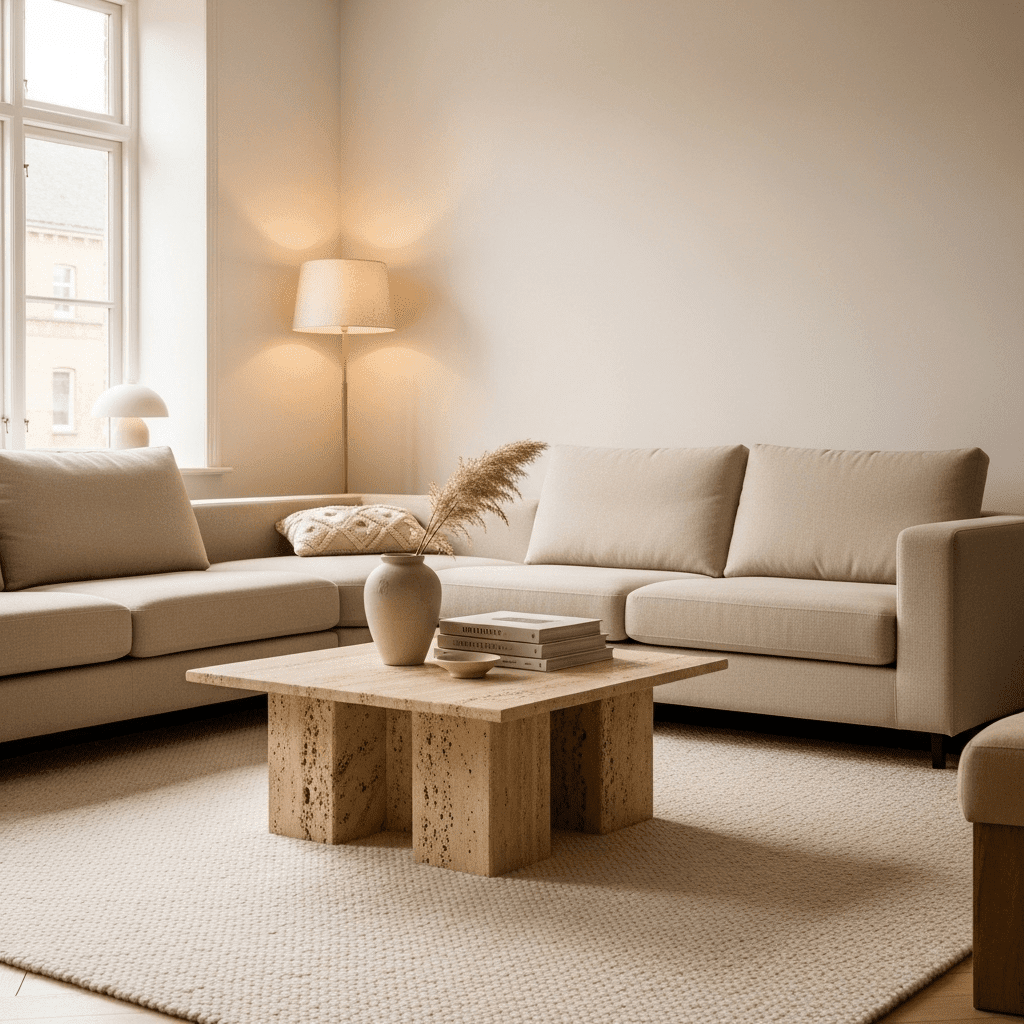 Modern living room center table ideas have embraced the “raw stone” movement. A solid, low-slung block of travertine provides a porous, matte texture that feels ancient yet perfectly suited for a minimalist, warm-neutral environment.