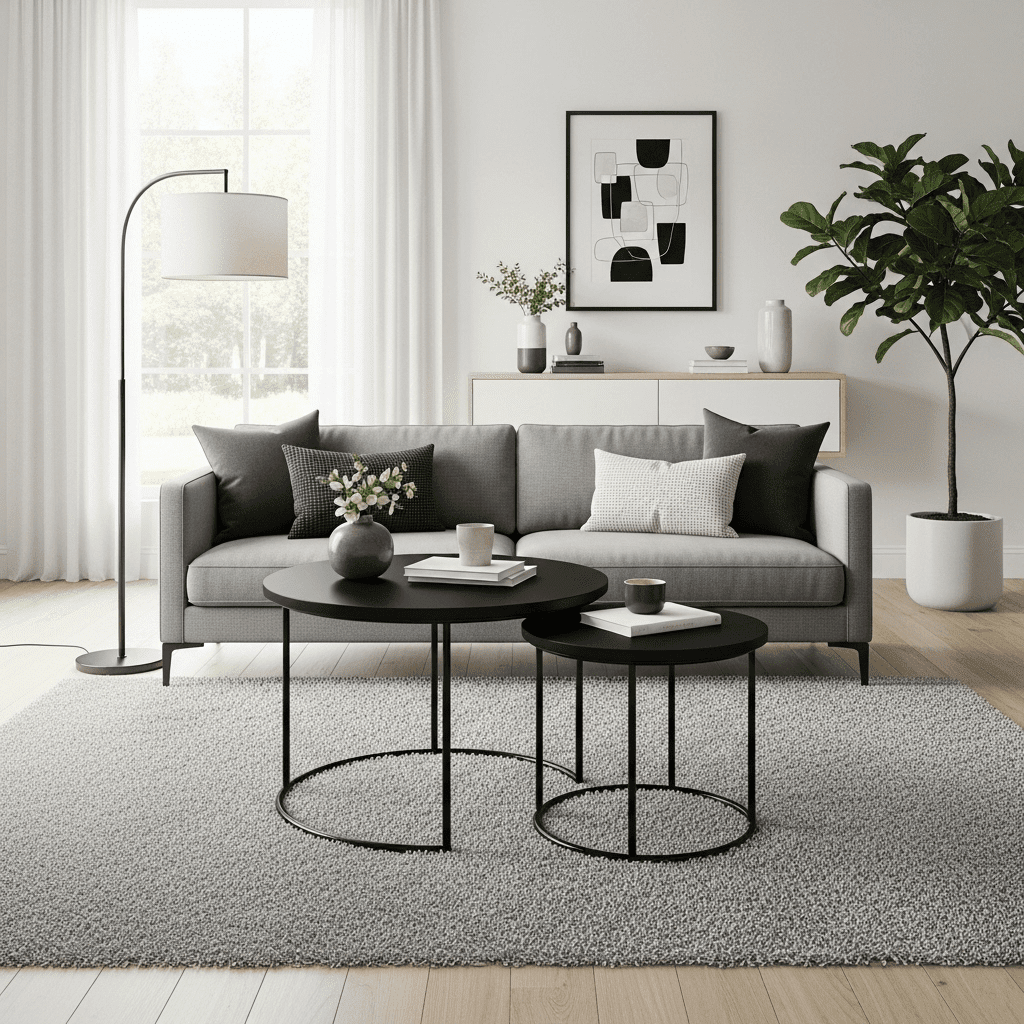 Modern living room center table ideas utilize “nesting” sets to create a versatile footprint. A set of two circular tables in matte black steel offers a sharp, industrial contrast that can be expanded to serve guests or tucked together for a clean look.