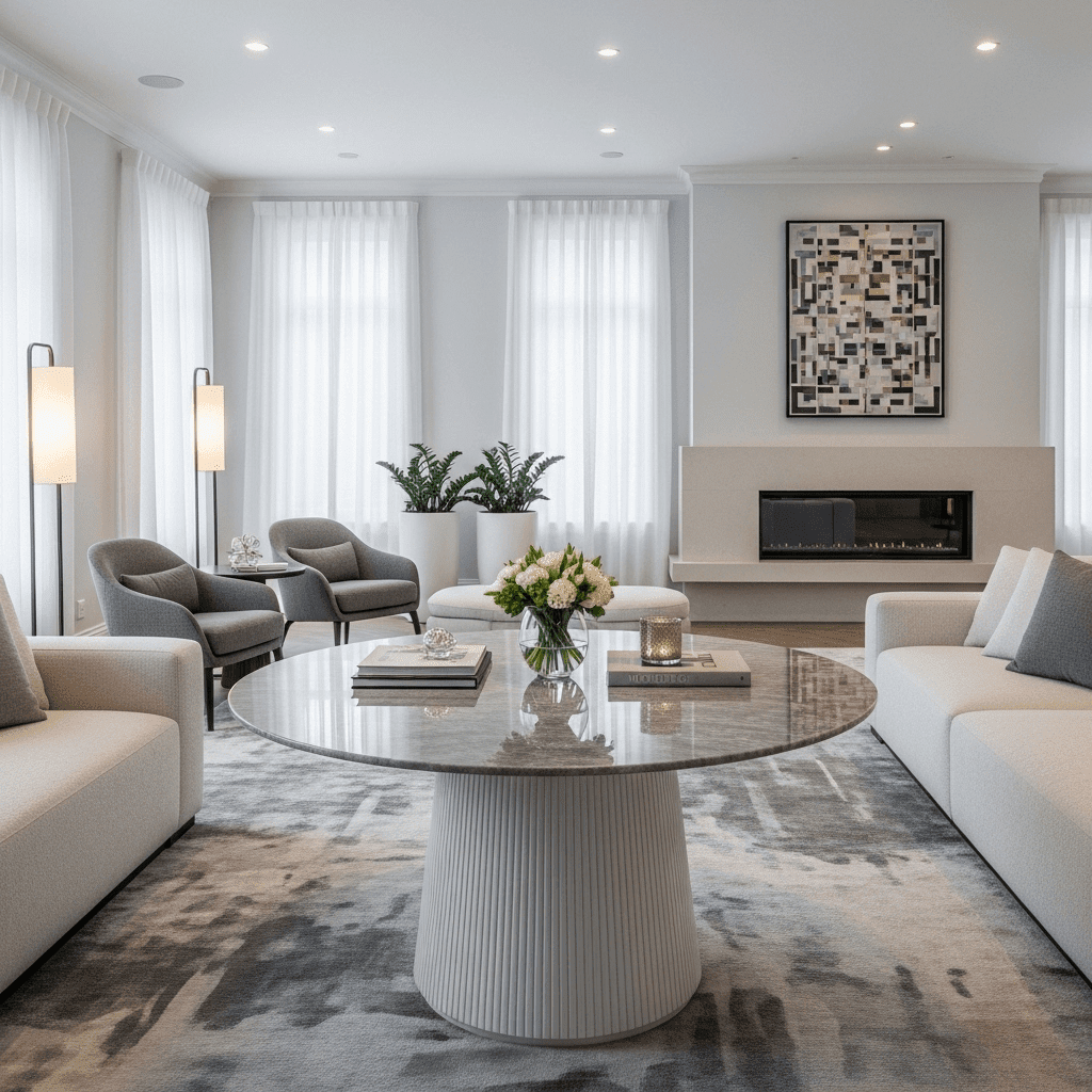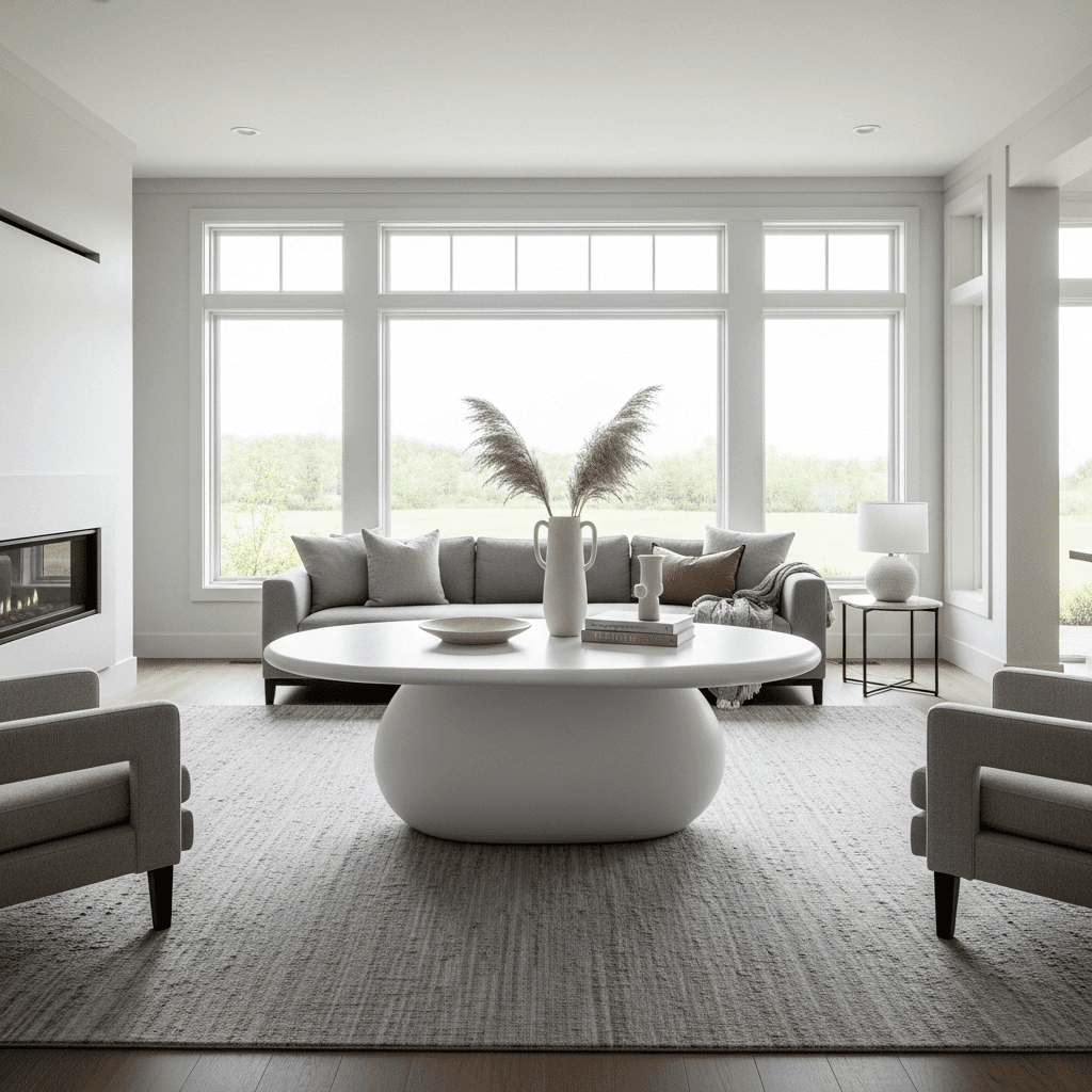 Modern living room center table ideas are moving away from perfect circles. An organic “pebble” or “amoeba” shaped table in a matte finish adds a playful, futuristic energy that breaks the rigid geometry of a traditional room.