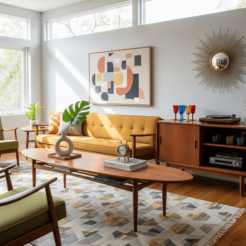 Modern living room center table ideas often revisit 1950s silhouettes. An elongated oval table in warm teak with “surfboard” edges and tapered legs provides an airy, retro-modern look that softens the sharp corners of a sectional sofa.
