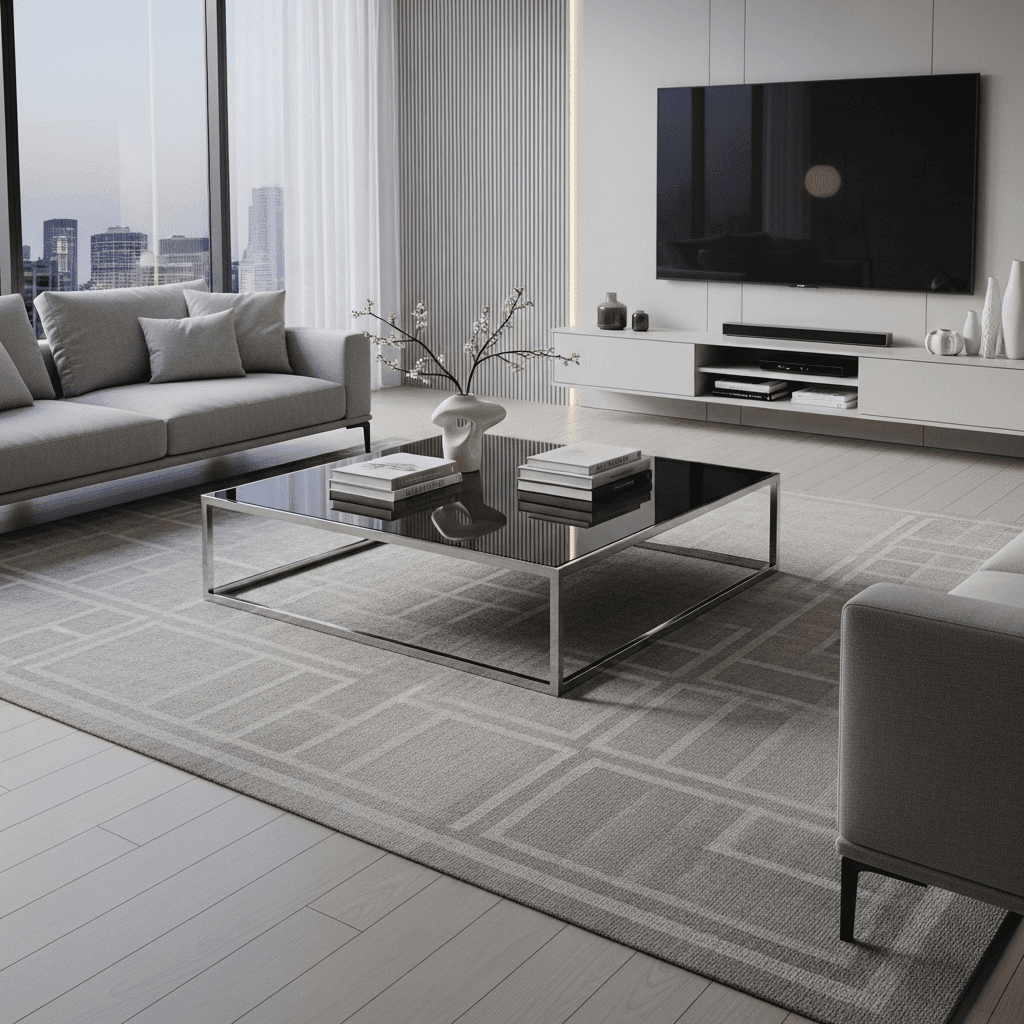 Modern living room center table ideas draw inspiration from 1970s “high-tech” design. A chrome frame paired with a dark smoked glass top offers a moody, reflective surface that pairs exceptionally well with leather furniture.