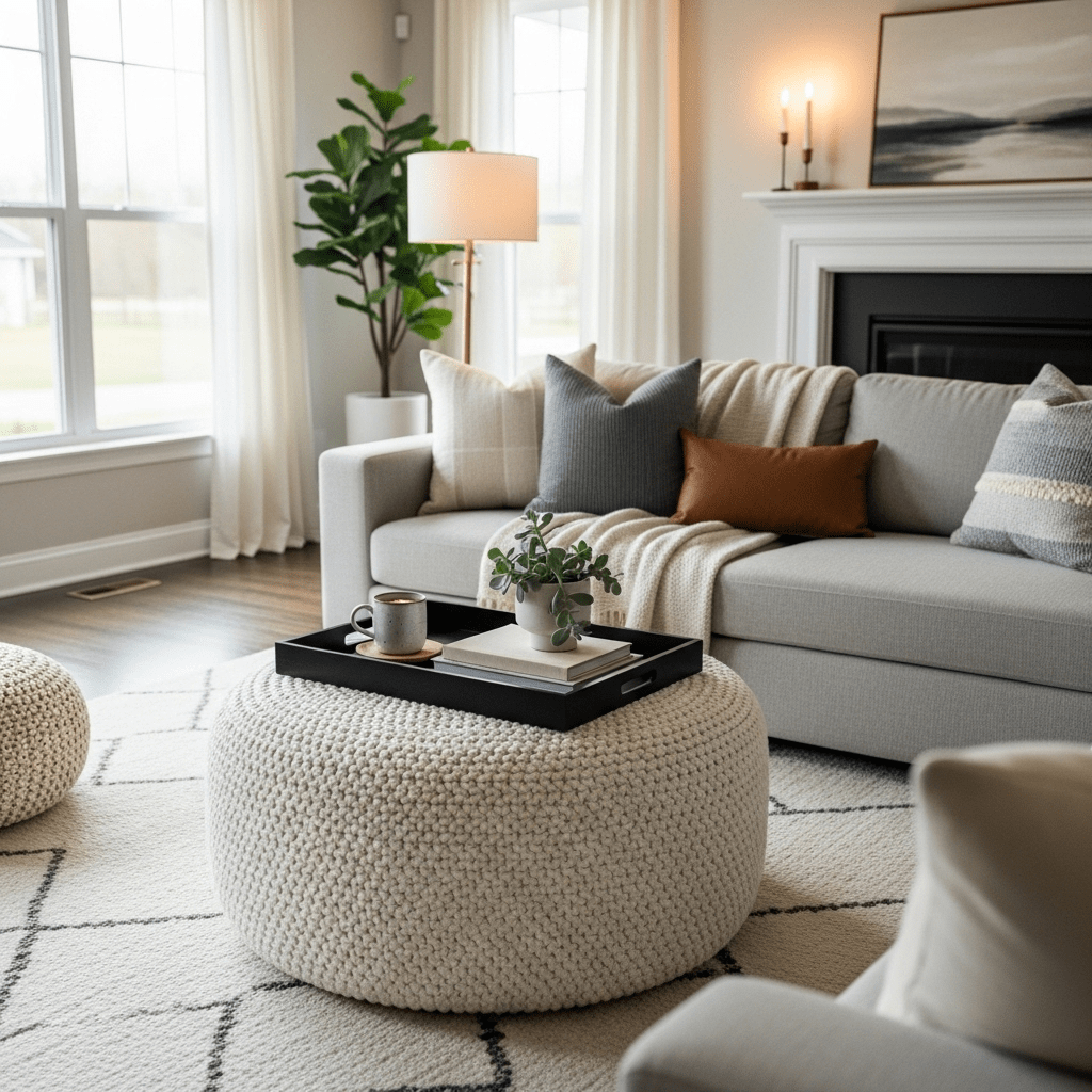 Modern living room center table ideas aren’t always hard-surfaced. A large, circular ottoman upholstered in trendy white bouclé fabric provides a soft, cozy centerpiece. Adding a sleek wooden tray on top ensures a stable surface for decor.