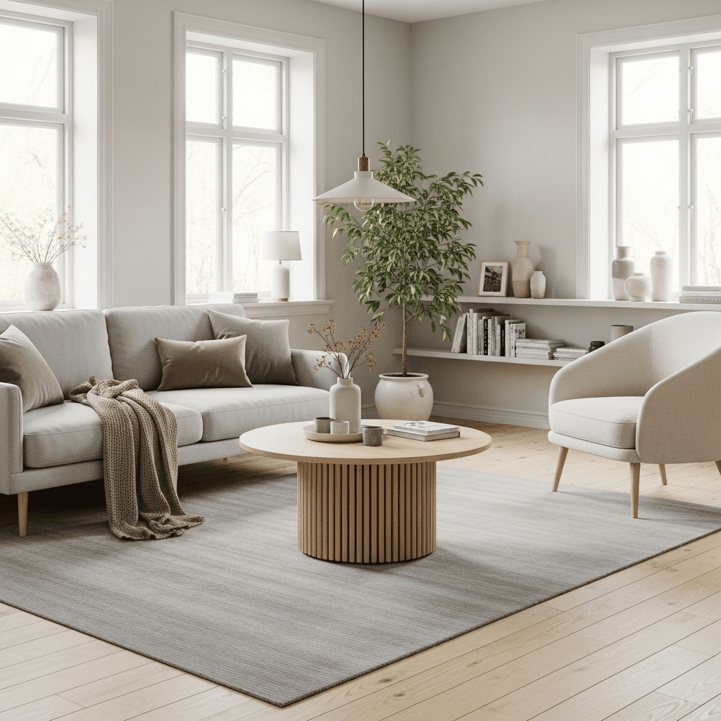 Modern living room center table ideas use vertical wood slats to add depth and “shadow play.” A cylindrical table made of light oak slats feels light and airy while providing a sturdy, organic anchor for the room.