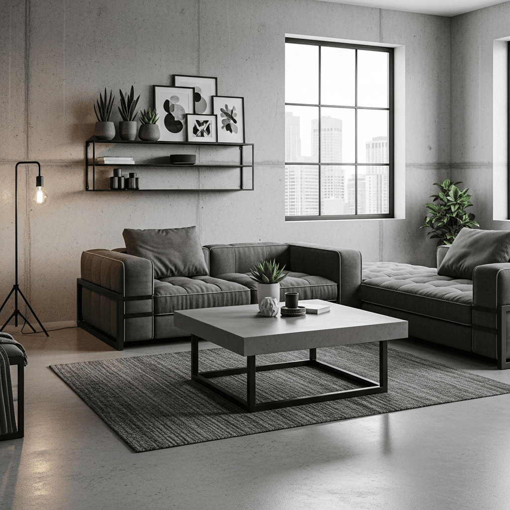 Modern living room center table ideas often pair “cold” materials like concrete with black steel. This heavy-duty look is perfect for high-traffic homes, offering a durable, “loft-style” centerpiece that only looks better with age.