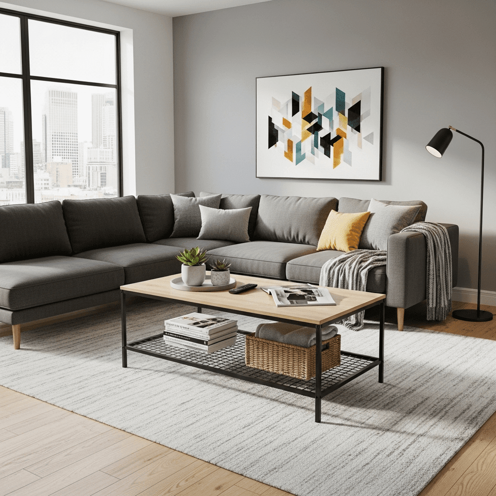 Modern living room center table ideas maximize functionality with a secondary shelf. Combining a wood top with a perforated metal lower tier allows you to hide remotes and books while keeping the primary surface clear.