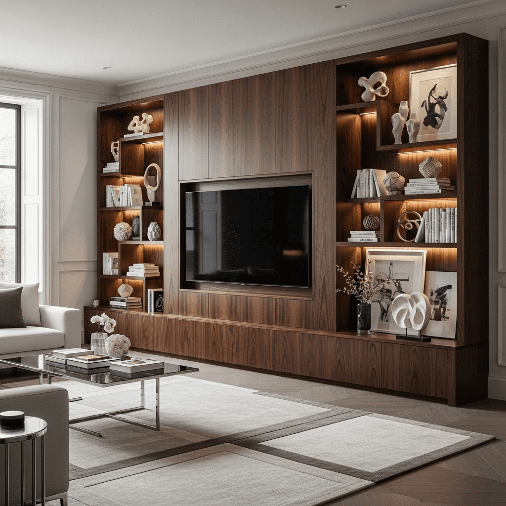 Lighting Integration: Add LED strips, puck lights, or picture lights to illuminate shelving and reduce TV viewing eye strain. Lighting elevates units from furniture to features.