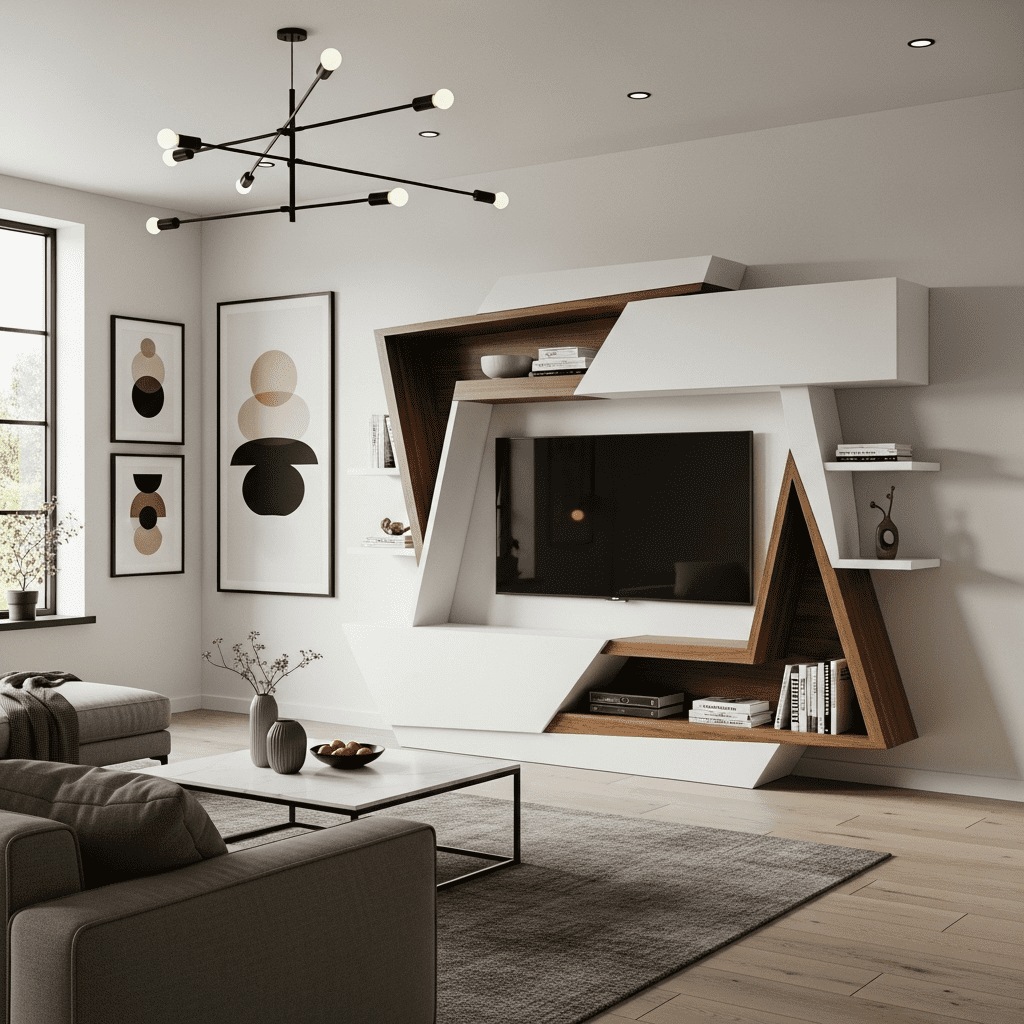Break from traditional symmetry with angular, geometric TV units featuring offset shelves, mismatched cabinet sizes, and dynamic compositions that create visual interest and modern edge.