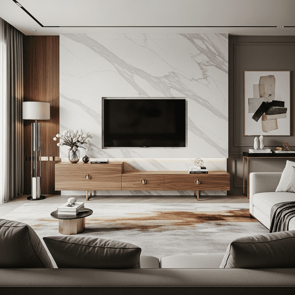 Elevate entertainment centers with premium marble surfaces and metallic accents. Book-matched marble slabs create stunning backdrops while brass or gold details add glamorous sophistication.