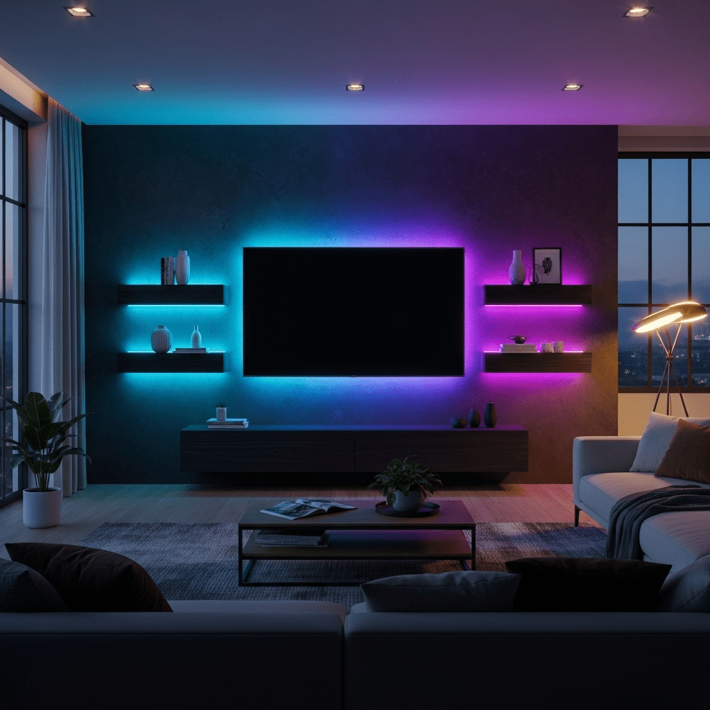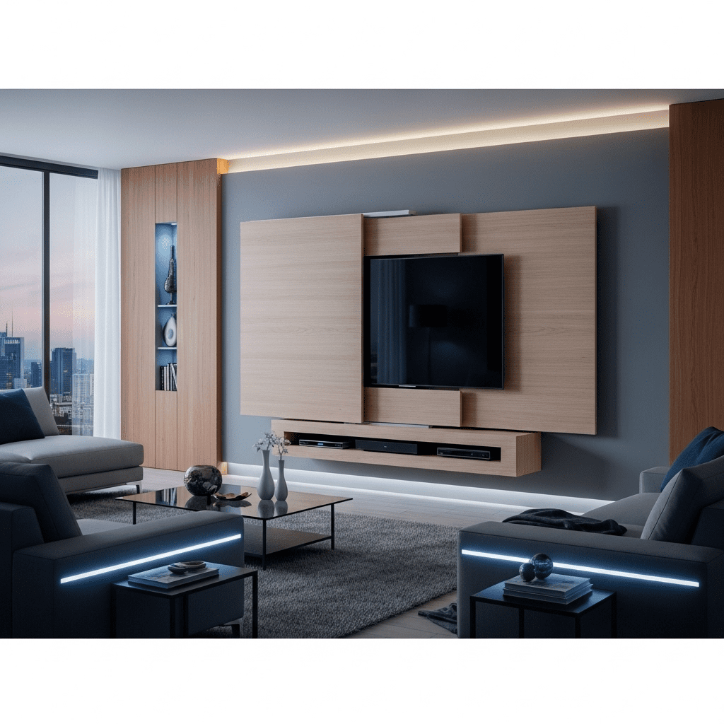 Create ambiance with integrated LED lighting behind TV units. Customizable colored lights or warm white backlighting adds depth, reduces eye strain, and creates stunning visual effects.
