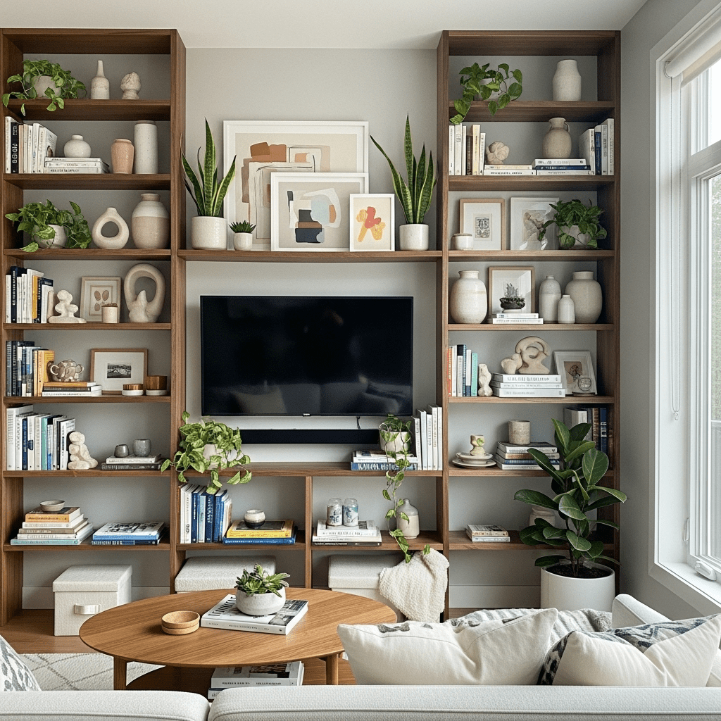 Showcase personality through open wooden or metal shelving surrounding the TV. Curated displays of books, plants, art objects, and decorative pieces create lived-in modern style.