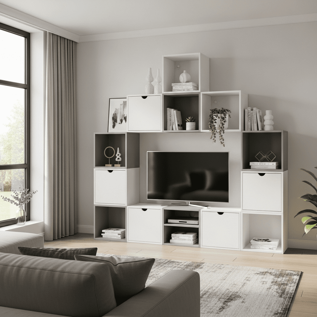Flexible modular units adapt to changing needs and spaces. Mix-and-match cubes, shelves, and cabinets in various sizes create customizable entertainment walls that evolve over time.