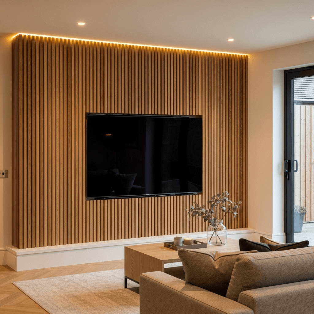 Vertical or horizontal wood slats create textured feature walls behind TVs. This design adds warmth and dimension while cleverly concealing wiring and creating acoustic benefits.