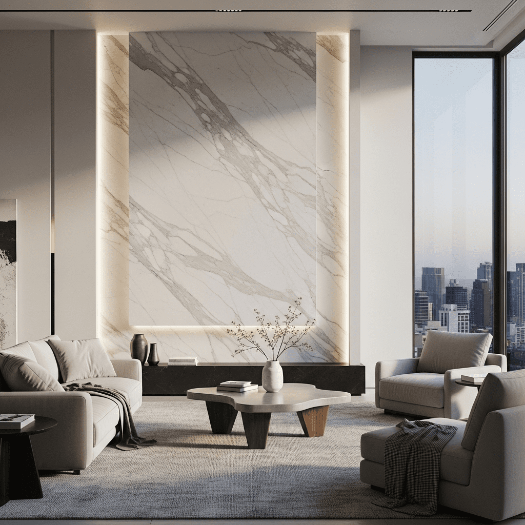 Incorporate dramatic natural stone installations as focal points. Book-matched marble or travertine slabs create stunning visual impact while adding organic luxury to contemporary spaces.