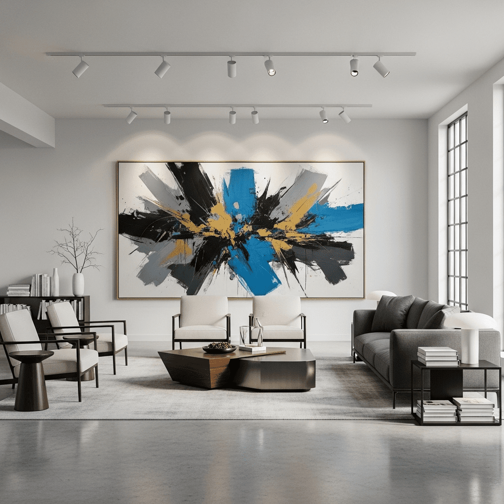 Transform your living room into a curated gallery with museum-quality lighting and oversized contemporary art. Statement pieces become the room’s focal point against sophisticated neutral backgrounds.