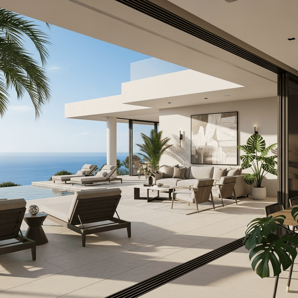 Blur boundaries between interior and exterior with floor-to-ceiling sliding glass doors, consistent flooring materials, and furniture that transitions between spaces effortlessly.