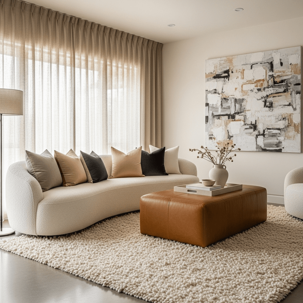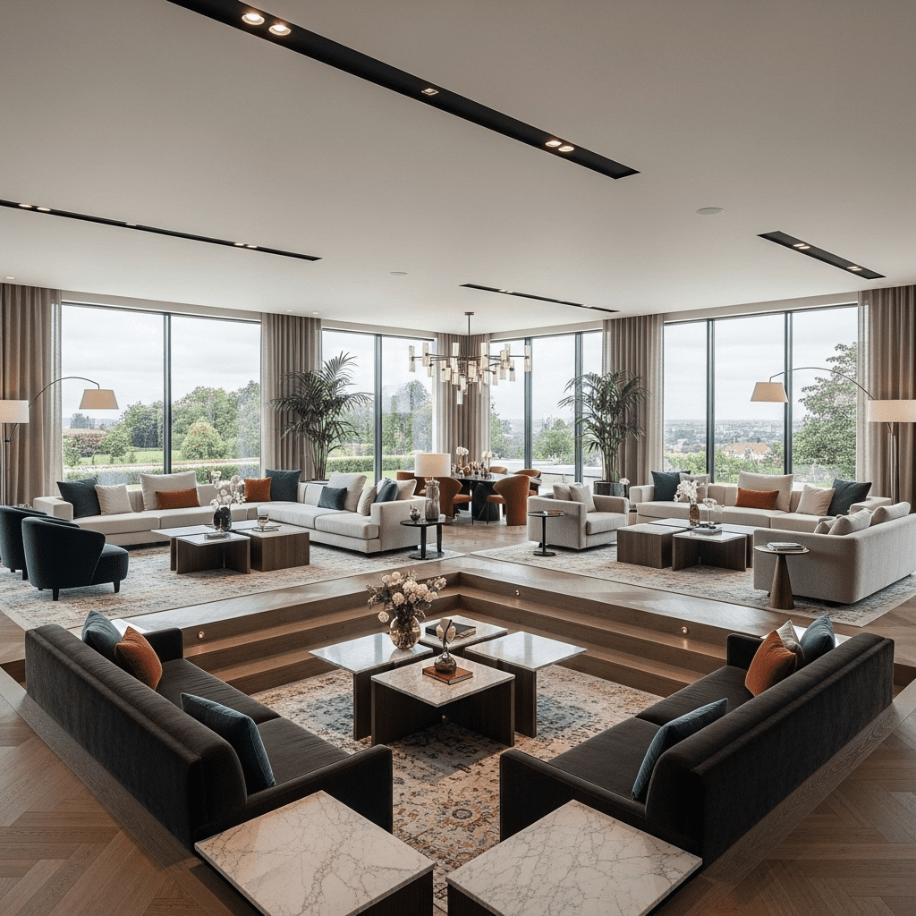 Modern luxury is defined by several key principles that distinguish these spaces from ordinary living rooms. Quality trumps quantity—each piece is carefully selected for its design merit and craftsmanship. Materials are premium: genuine marble, solid hardwoods, top-grain leather, and natural fibers.