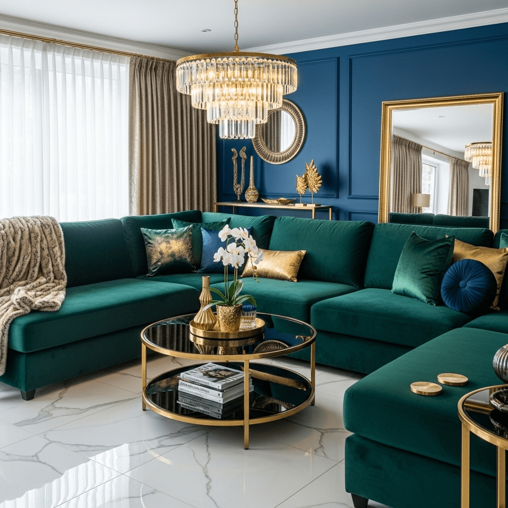 Rich emerald greens, sapphire blues, and deep amethyst create sumptuous environments when paired with metallic accents. Velvet upholstery and glossy finishes amplify the luxurious atmosphere.
