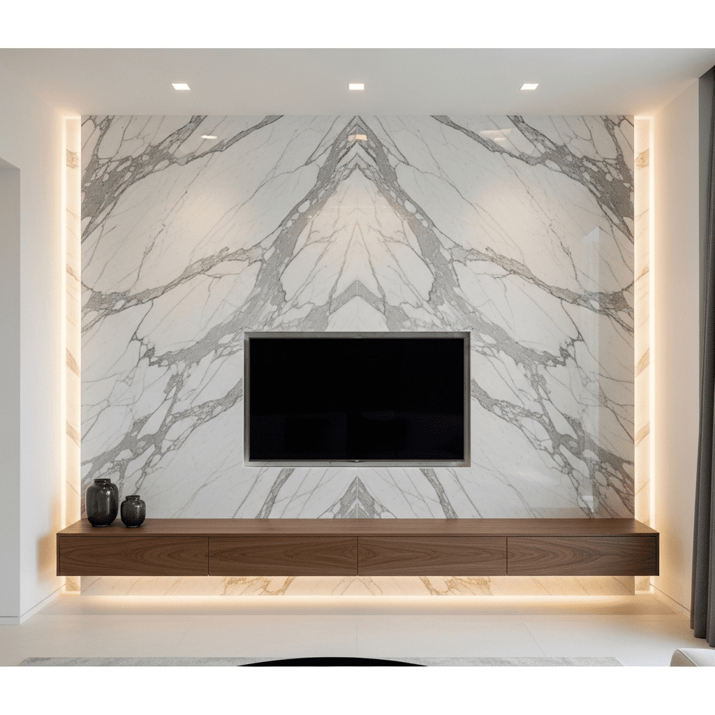 Floor-to-ceiling book-matched marble slabs create breathtaking backdrops for wall-mounted TVs. Calacatta or Statuario marble with dramatic veining becomes architectural art, with integrated LED lighting accentuating natural stone patterns.